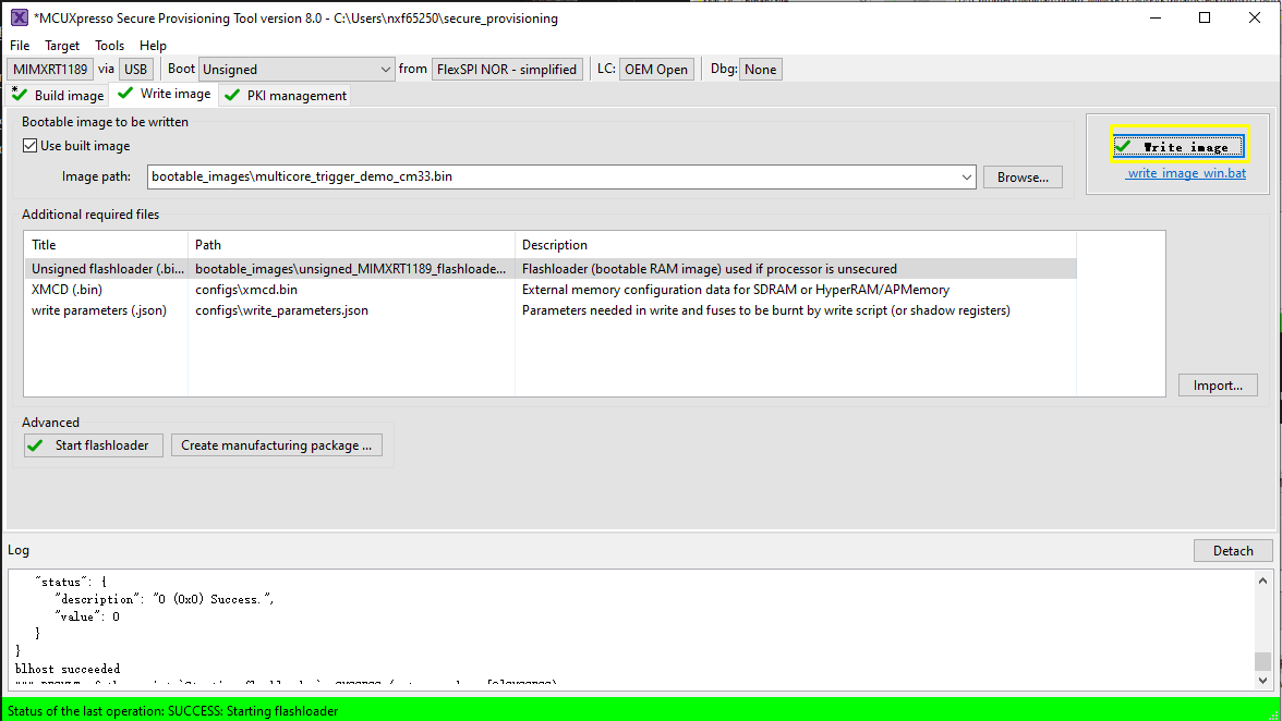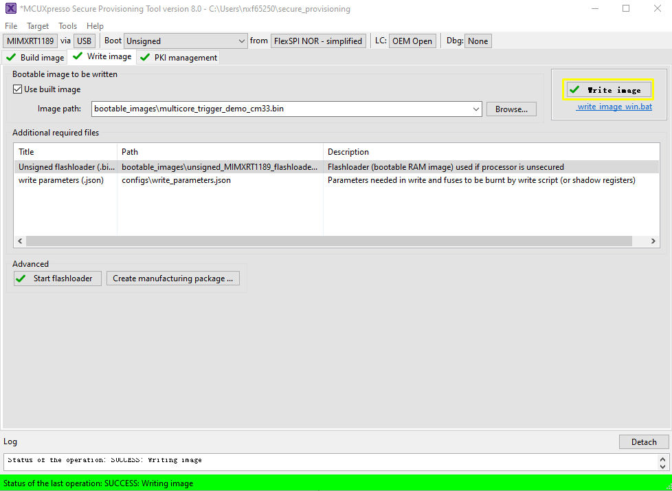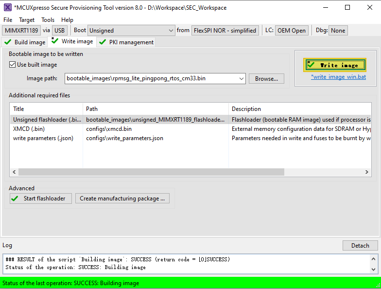 Now switch to the Write Image tab. All information is automatically generated from the previous page. Connect both USB OTG1 port (J33) and MCU-Link port (J53) to the computer and power up the board (or reset via SW3). Make sure that the EVK board boot configuration switch SW5[1..4] are on 0001 SDP mode and click Write Image.