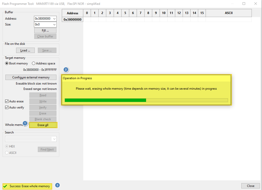 Success: Erase whole memoryshows up, the board should have restored to a good state to work in various mode.