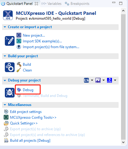 evkmimxrt595_hello_world [Debug]to launch the debug session.|