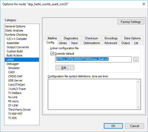 The post build scripts create the DSP images. For details, see Makefile.include in any DSP example. To reduce the image size and make image copy more efficient, they are split into SRAM part; TCM part, and uncached SRAM part. DSP images are set and linked into Cortex M33 side. For IAR, the linker is set in Project Options > Linker > Extra Options. For ArmGCC or Linux environment, set in any DSP example\cm33\incbin_gcc.S.