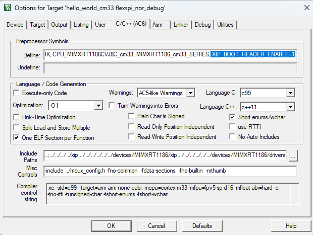 XIP_BOOT_HEADER_ENABLEin the compiler setting.For MDK, change the macro