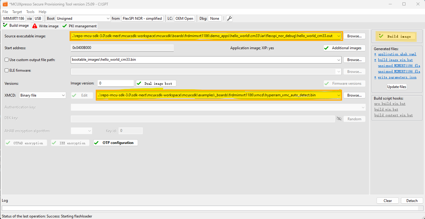 The new image constructed under Build images is still not a complete image, and the Memory Configuration Block is missing. When writing image, SPT downloads the contents of the Memory Configuration Block to FLASH.