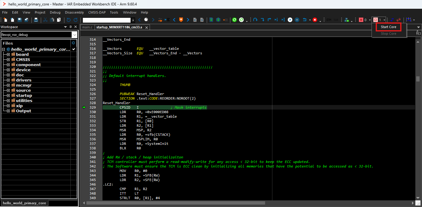 Begin with a simple dual-core version of the Hello World application. The multicore Hello World IAR workspaces are available in the folder: