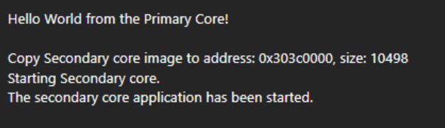 Hello_Worldmulticore demos are now running. A banner appears on the terminal and the LED D6 blinks. If this is not true, check your terminal settings and connections.