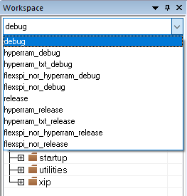 Debug– Compiler optimization is set to low, and debug information is generated for the executable. The linker file isRAMlinker, where text and data section is put in internal TCM.Release– Compiler optimization is set to high, and debug information is not generated. The linker file isRAMlinker, where text and data section is put in internal TCM.flexspi_nor_debug– Project configuration is same as the debug target. The linker file isflexspi_norlinker, where text is put in flash and data put in TCM.flexspi_nor_release– Project configuration is same as the release target. The linker file isflexspi_norlinker, where text is put in flash and data put in TCM.hyperram_debug– Project configuration is same as the debug target. The linker file is HYPERRAM linker, where text is put in internal TCM and data put in HYPERRAM.hyperram_release– Project configuration is same as the release target. The linker file is HYPERRAM linker, where text is put in internal TCM and data put in HYPERRAM.hyperram_txt_debug– Project configuration is same as the debug target. The linker file isHYPERRAM_txtlinker, where text and data section is put in HYPERRAM.hyperram_txt_release– Project configuration is same as the release target. The linker file isHYPERRAM_txtlinker, where text and data section is put in HYPERRAM.flexspi_nor_hyperram_release- Project configuration is same as the release target. The linker file isflexspi_nor_hyperramlinker, where text is put in flash and data put in HYPERRAM.flexspi_nor_hyperram_debug– Project configuration is same as the debug target. The linker file isflexspi_nor_hyperramlinker, where text is put in flash and data put in HYPERRAM. For this example, select hello_world_demo– debug.