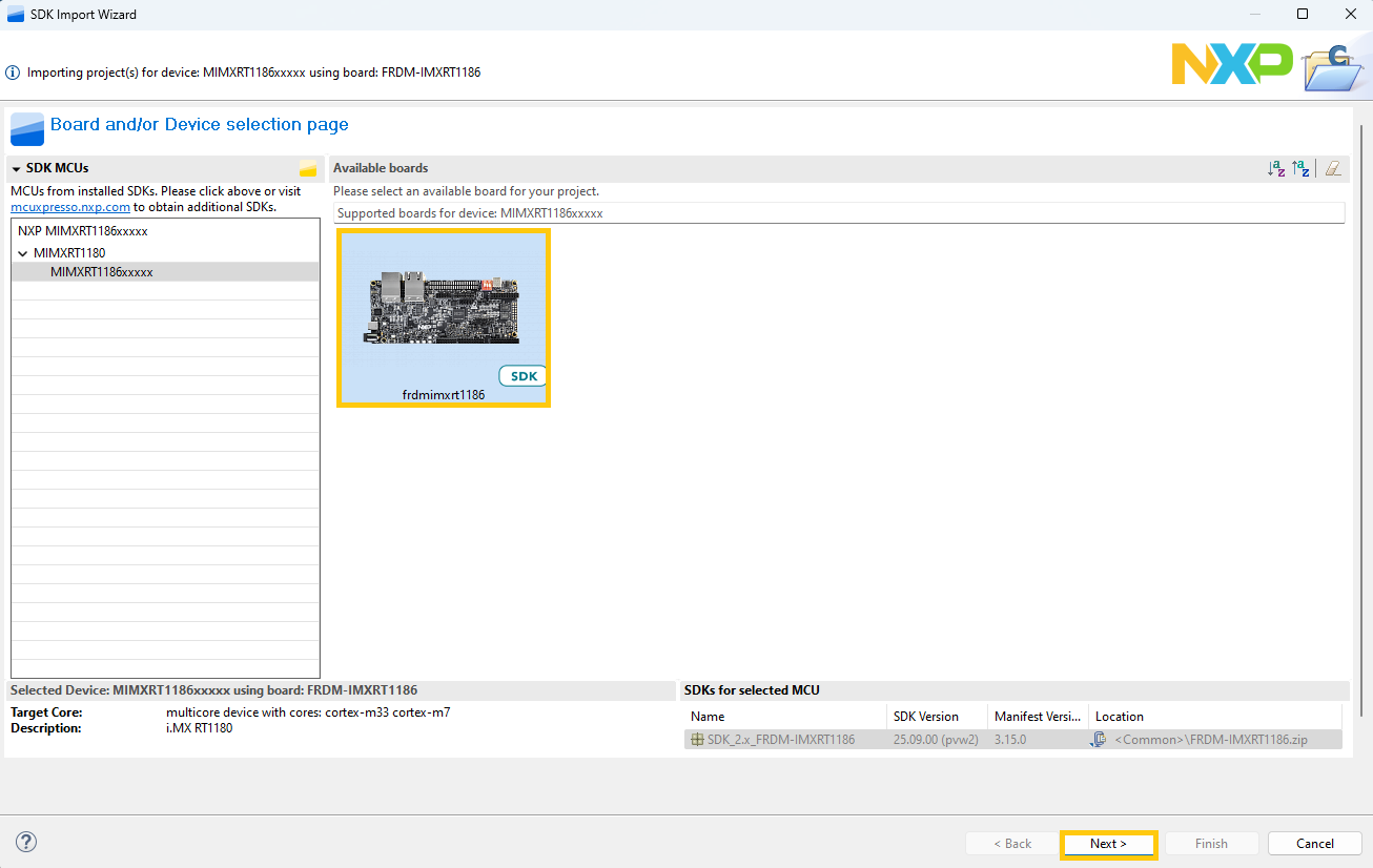 Multicore examples are imported into the workspace in a similar way as single core applications, explained in Build an example application. When the SDK zip package for frdmimxrt1186 is installed and available in the Installed SDKs view, click Import SDK example(s)… on the Quickstart Panel. In the window that appears, select frdmimxrt1186 and click Next.
