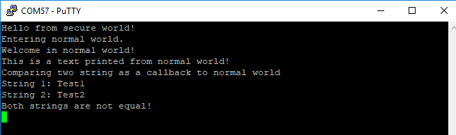 The TrustZone hello_world application is now running and a banner is displayed on the terminal. If this is not true, check your terminal settings and connections.