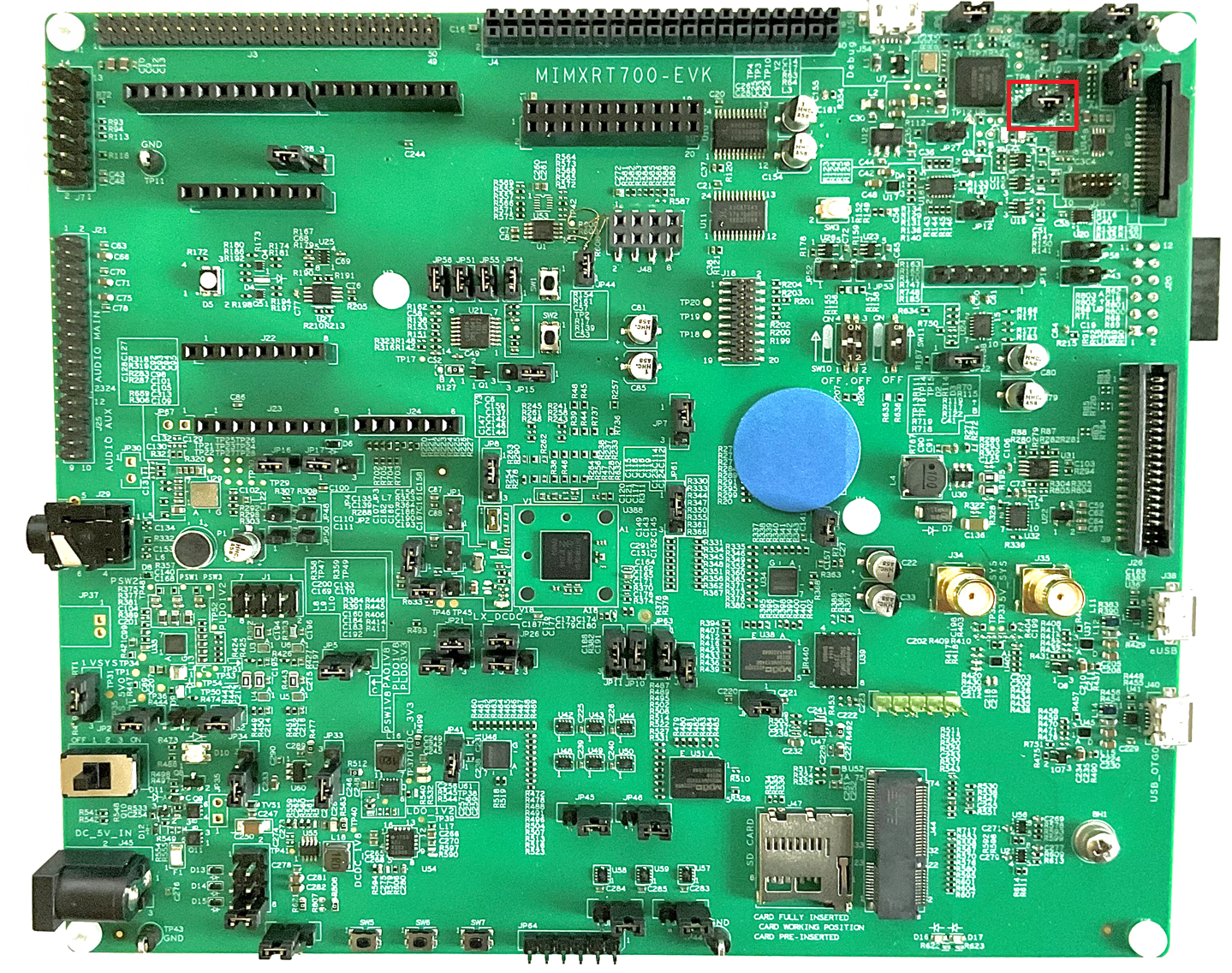 In addition to standalone probes, the onboard MCU-Link debug probe can be used to debug HiFi4 DSP over SWD port. The RT700 EVK has an LPC55S69 MCU (top right corner on EVK) and by default has been pre-programmed as CMSIS-DAP probe. CMSIS-DAP is not compatible with HiFi4 the DSPs, but to enable serial logging of Core 1, CMSIS-DAP firmware is required.