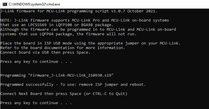 Install MCU-Link, a command-line tool for programming onboard MCU-Link debug probe with the CMSIS-DAP and J-Link firmware. MCU-Link installer is available for download from: https://www.nxp.com/design/design-center/software/development-software/mcuxpresso-software-and-tools-/mcu-link-debug-probe:MCU-LINK#t996.
