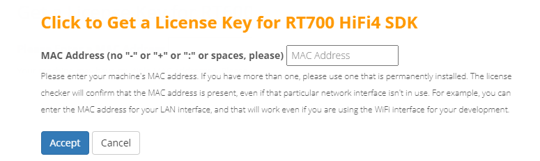 Currently RT700 supports node-locked license for Xtensa tools. A node-locked license permits tools to run on a specific computer, tied to the MAC address of the primary network interface permanently attached to the machine.