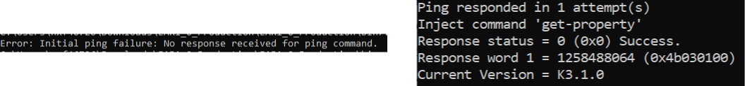 The following examples show when the device did not enter in ISP (left) and when the device was programmed properly (right).