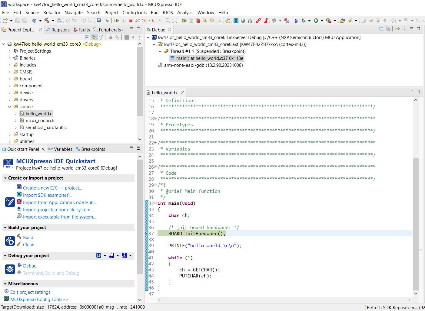 This section describes the steps required to configure MCUXpresso IDE to build, run, and debug example applications. The hello_world demo application targeted for the KW47-LOC hardware platform is used as an example, though these steps can be applied to any example application in the MCUXpresso SDK.