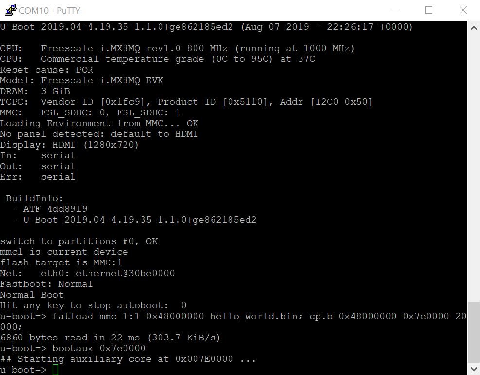 hello_world.binis made from the debug/release target, which means the binary file will run at TCM, use the following commands to boot:fatload mmc 1:1 0x48000000 hello_world.bincp.b 0x48000000 0x7e0000 0x20000bootaux 0x7e0000