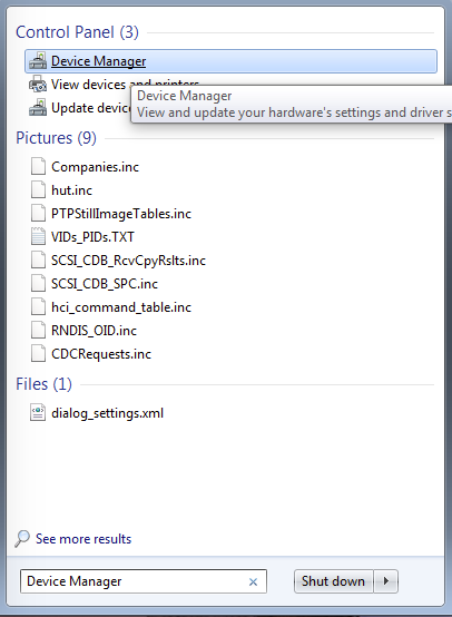 To determine the COM port, open the Windows operating system Device Manager. This can be achieved by going to the Windows operating system Start menu and typing Device Manager in the search bar, as shown in Figure 1.