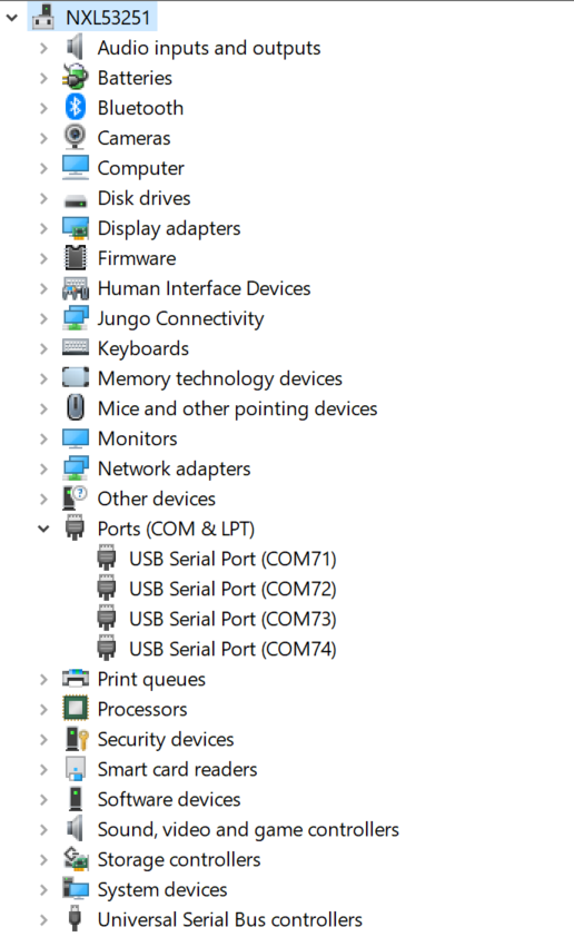 On Windows OS, open the device manager, find USB serial Port in Ports (COM & LPT). Assume that the ports are COM71 - COM74. COM73 is for the debug message from the Cortex-A55 and COM74 is for the Cortex-M33. The port number is allocated randomly, so opening both is beneficial for development. On Ubuntu OS, find the TTY device with name