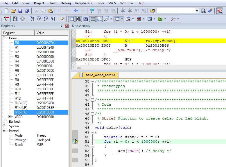 Begin with a simple dual-core version of the Hello World application. The multicore Hello World Keil MSDK/μVision workspaces are located in this folder: