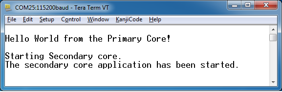 Both the primary and the auxiliary image is loaded into the device flash memory. After clicking the “Run” button, the primary core application is executed. During the primary core code execution, the auxiliary core is released from the reset. The hello_world multicore application is now running and a banner is displayed on the terminal. If this does not appear, check your terminal settings and connections.