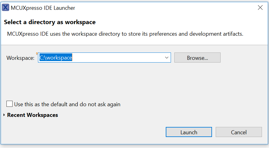 Open MCUXpresso IDE and open an existing or a new workspace location.