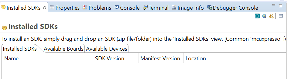 Drag and drop the package archive into the MCUXpresso Installed SDKs area in the lower right of the main window.