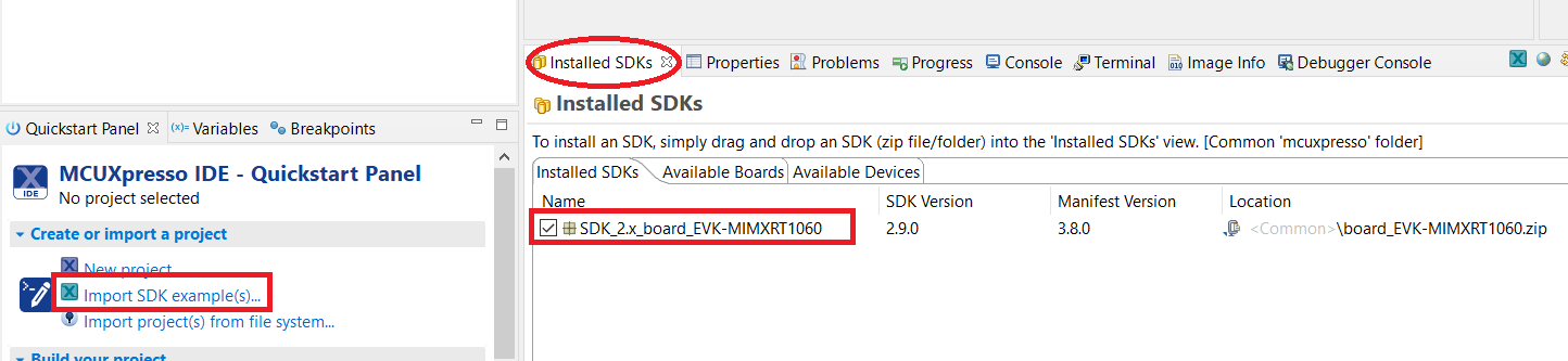 After the SDK is loaded successfully, select the Import the SDK examples(s)… to add examples to your workspace.