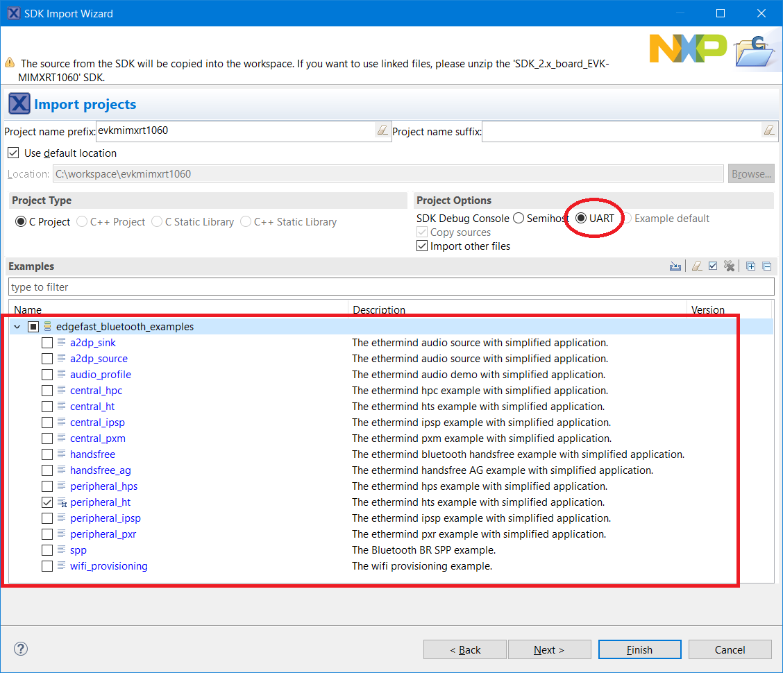 Select the evkmimxrt1060 board EdgeFast Bluetooth example. For example, peripheral_ht.