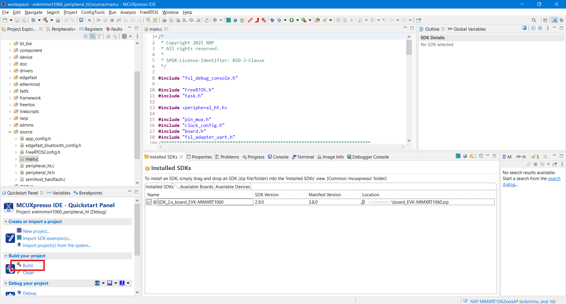 This document uses peripheral_ht example to describe the steps to open a project, build an example, and run a project on MCUXpresso IDE.