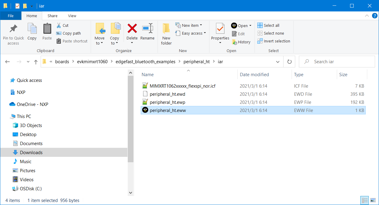 <root>/boards/evkmimxrt1060/edgefast_bluetooth_examples/peripheral_ht/iarOpen the IAR workspace file. For example, the highlighted *.eww format file