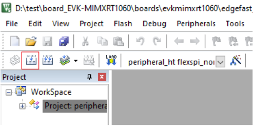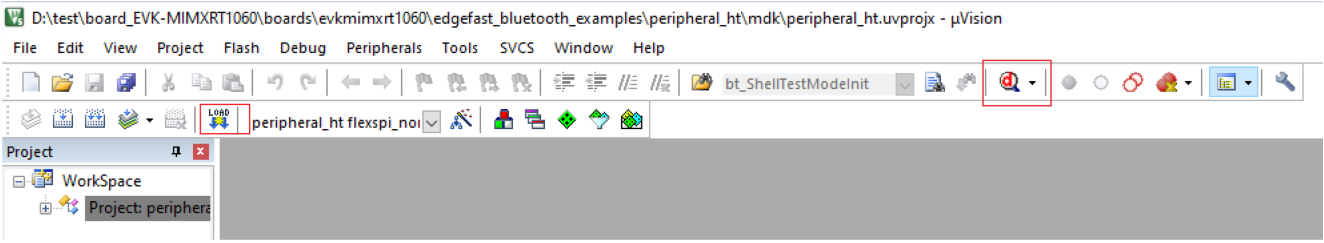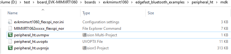 <root>/boards/evkmimxrt1060/edgefast_bluetooth_examples/peripheral_ht/mdk.Open the mdk workspace file. For example, the highlighted *.uvmpw format file.