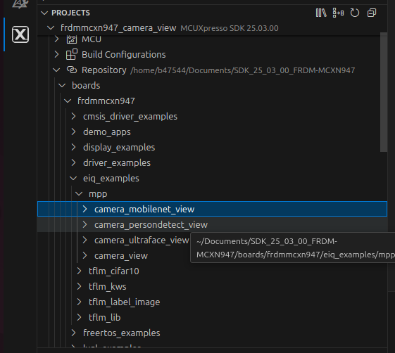 The boards directory contains example application projects for supported toolchains, see Figure 3. When using Command line, the example applications can be built using scripts for GCC toolchain in SDK folder /boards/<board_name>/eiq_examples/ <example_name>/armgcc/.