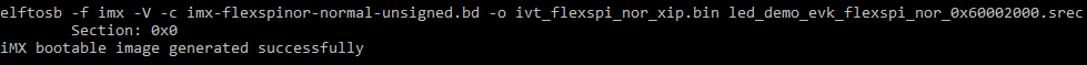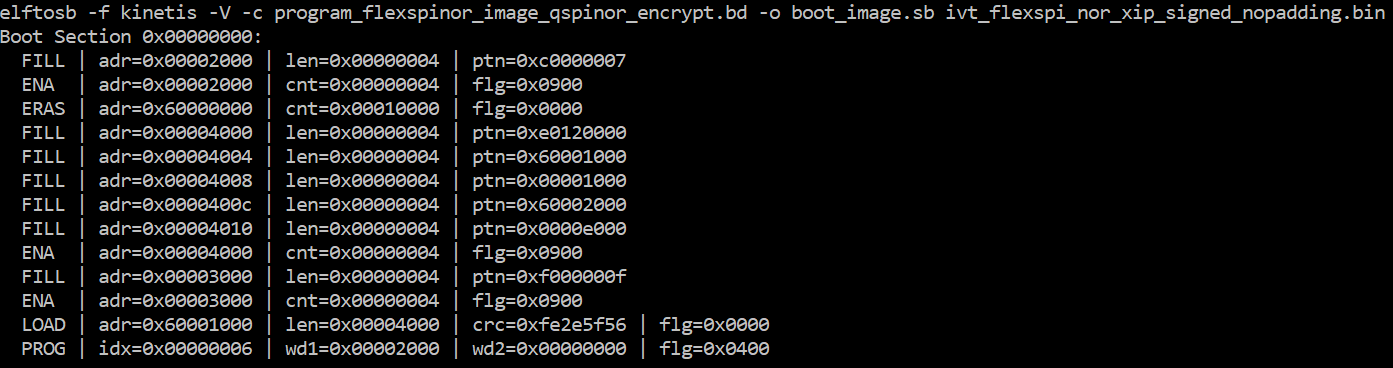 After the command “program_flexspinor_image_qspinor_encrypt.bd -o boot_image.sb ivt_flexspi_nor_xip_signed_nopadding.bin” in the figure above , a file named “boot_image.sb” is generated in the folder that contains the elftosb utility executable.
