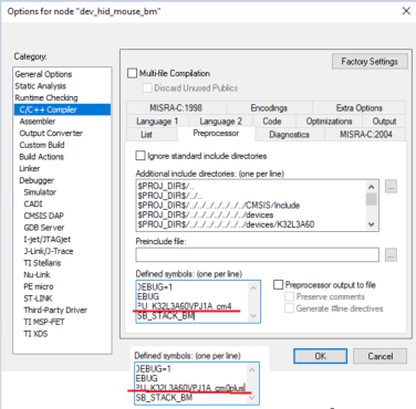 4. In M4 project in IAR, in option–>c/c++ compiler–>Preprocessor, change the CPU MACRO from “CPU_K32W042S1M2VPJ_cm4” to “CPU_K32W042S1M2VPJ_cm0plus”.