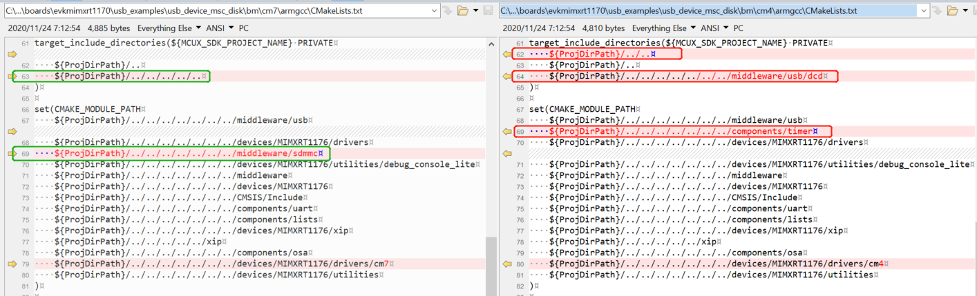 Open the CMakeLists.txt of the two examples respectively. The two files are respectively located under <install_dir>/boards/evkmimxrt1170/usb_examples/usb_device_msc_disk/bm/cm7/armgcc and <install_dir>/boards/evkmimxrt1170/usb_examples/usb_device_msc_disk/bm/cm4/ armgcc.