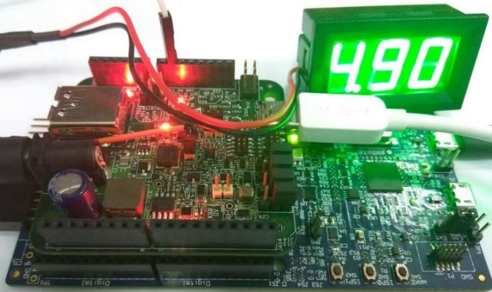 Connect a voltmeter to VBus (J5) of the sink role board. The voltmeter at the sink role shows approximately 5 V.