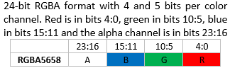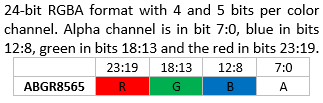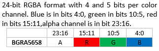 Attention: OpenVG VGImageFormat Note: The bits for each color channel are stored within a machine word from MSB to LSB in the order indicated by the pixel format name. This is the opposite of the original VG_LITE_* formats that are ordered from LSB to MSB. The formats with the same organization are listed in the same row as their VG_Lite counterparts.