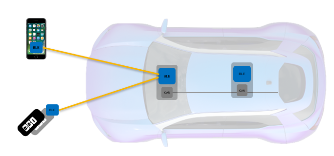 The Figure 1 shows an example deployment of CCC Digital Key R3. Inside the car, there are two Bluetooth Low Energy anchors connected to each other. The Controller Area Network (CAN) bus connects these anchors and is used to exchange security data and other information. Any anchor can perform both advertising and scanning and it is able to connect to a CCC Digital Key R3-enabled smartphone as well as to a non-CCC key fob.