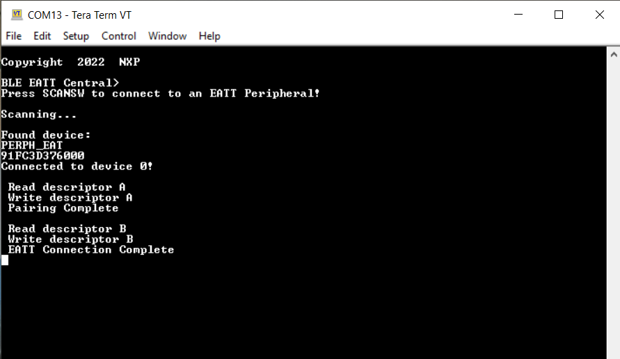 The application can be tested using another board flashed with the EATT Central application as described in the EATT Peripheral.