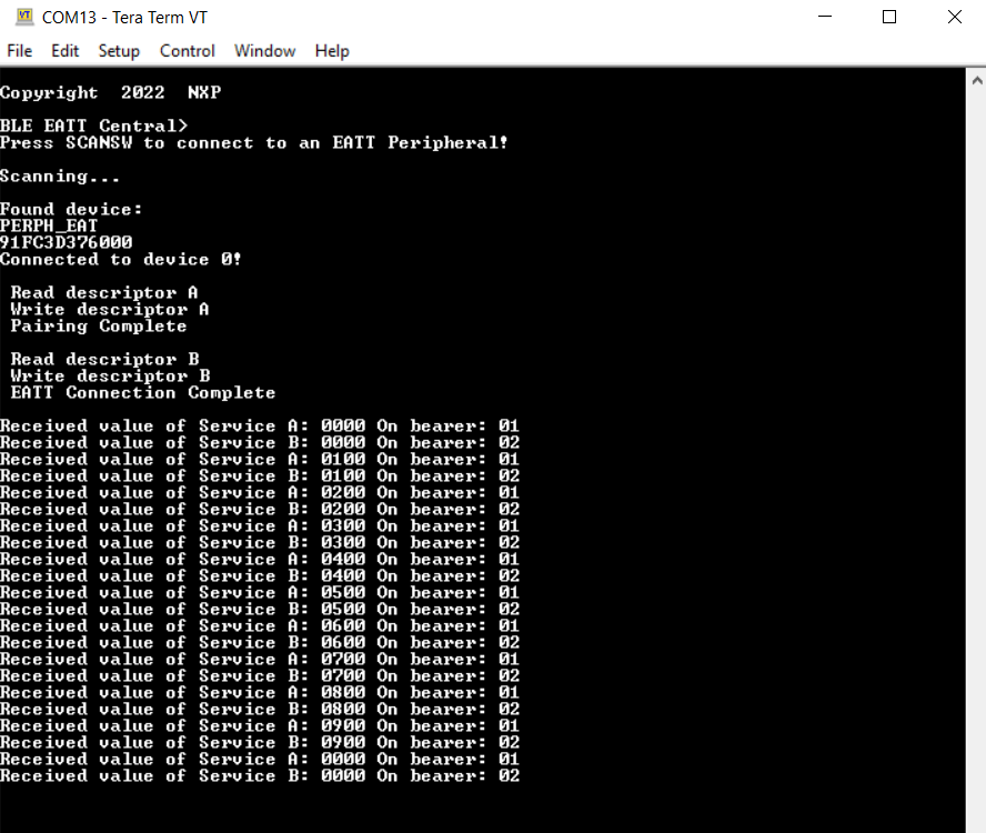 Output console on the EATT Central connected with an EATT Peripheral