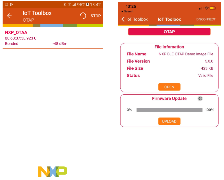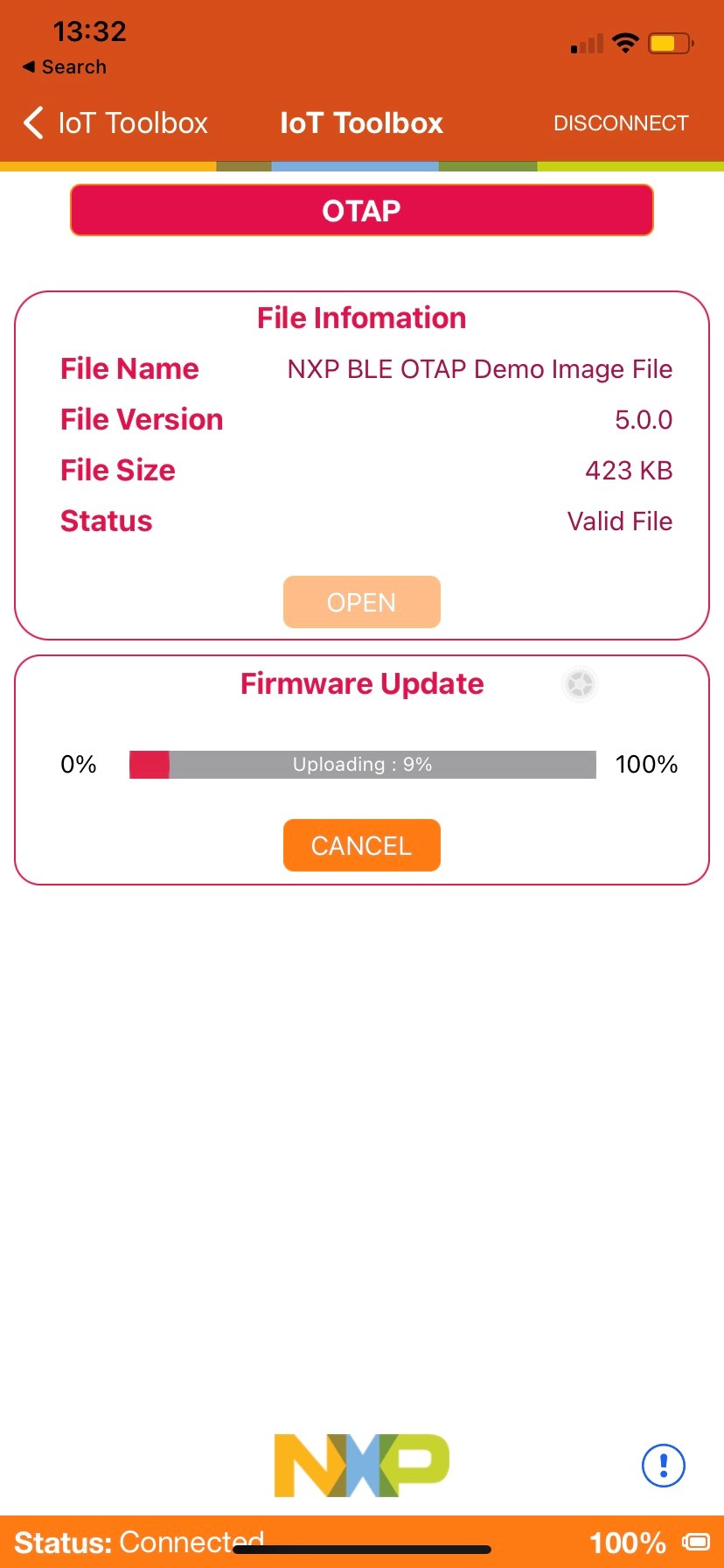 Start the Kinetis Bluetooth LE Toolboxapplication on your mobile device and start the OTAP Tool. The application starts scanning.