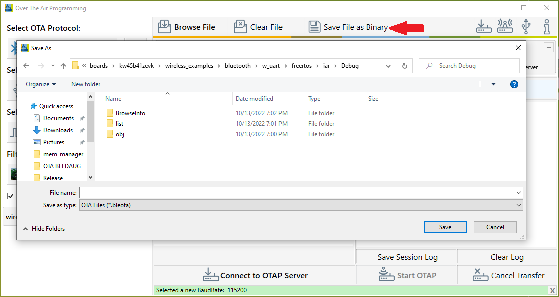 .bleotaformat, create the application. In order to load the image file into the Over the Air Programming application and create the .sb3 file, follow the instructions described in Usage with Over The Air Programming Tool. Once the.sb3file is created, press the “Save File as Binary” button to create the.bleotafile. See the figure below.