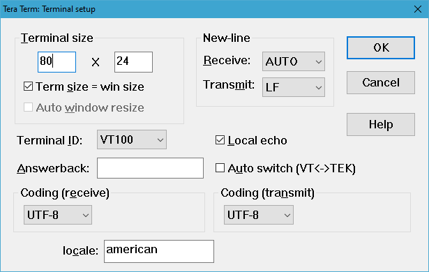 Wireless ranging application can be used either by using a console or by using a Python script environment. To use the console, connect to each device COM port with Tera Term using the setup (putty is not supported), as shown in the figure below.