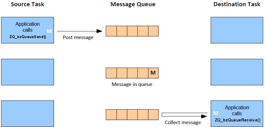 A message can be placed in a (created) queue using the function ZQ_bZQueueSend() and a message can be retrieved from a queue using the function ZQ_bZQueueReceive(). This is illustrated in the following figure.