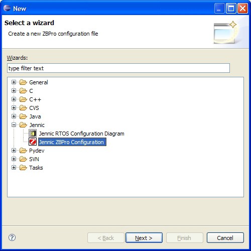 File > New > Other from the main menu. Check that a Jennic option exists in the Select a Wizard dialogue box - expanding the Jennic option should show “ZBPro Configuration”, as illustrated in the screenshot below.