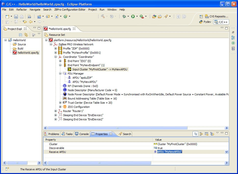 Endpoint entries, one for each endpoint on the Coordinator, with each endpoint having child entries specifying the input and output clusters used (note that each input cluster must be paired with an APDU).
