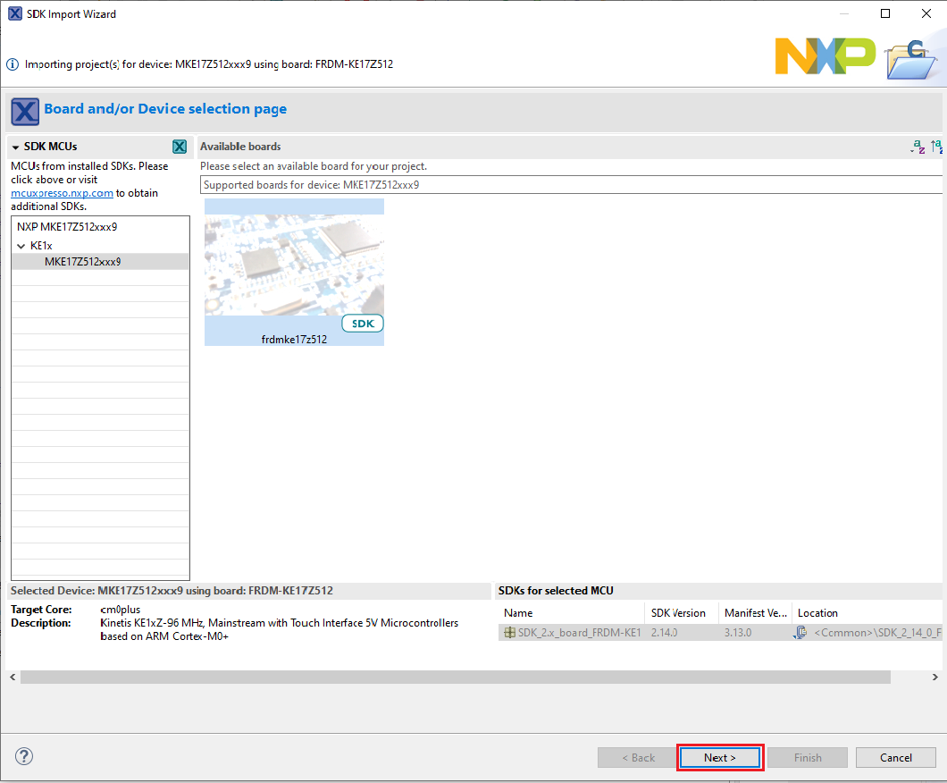 In the window that appears, expand the KE1x folder and select MKE17Z512xxx9 . Then, select frdmke17z512 and click Next.