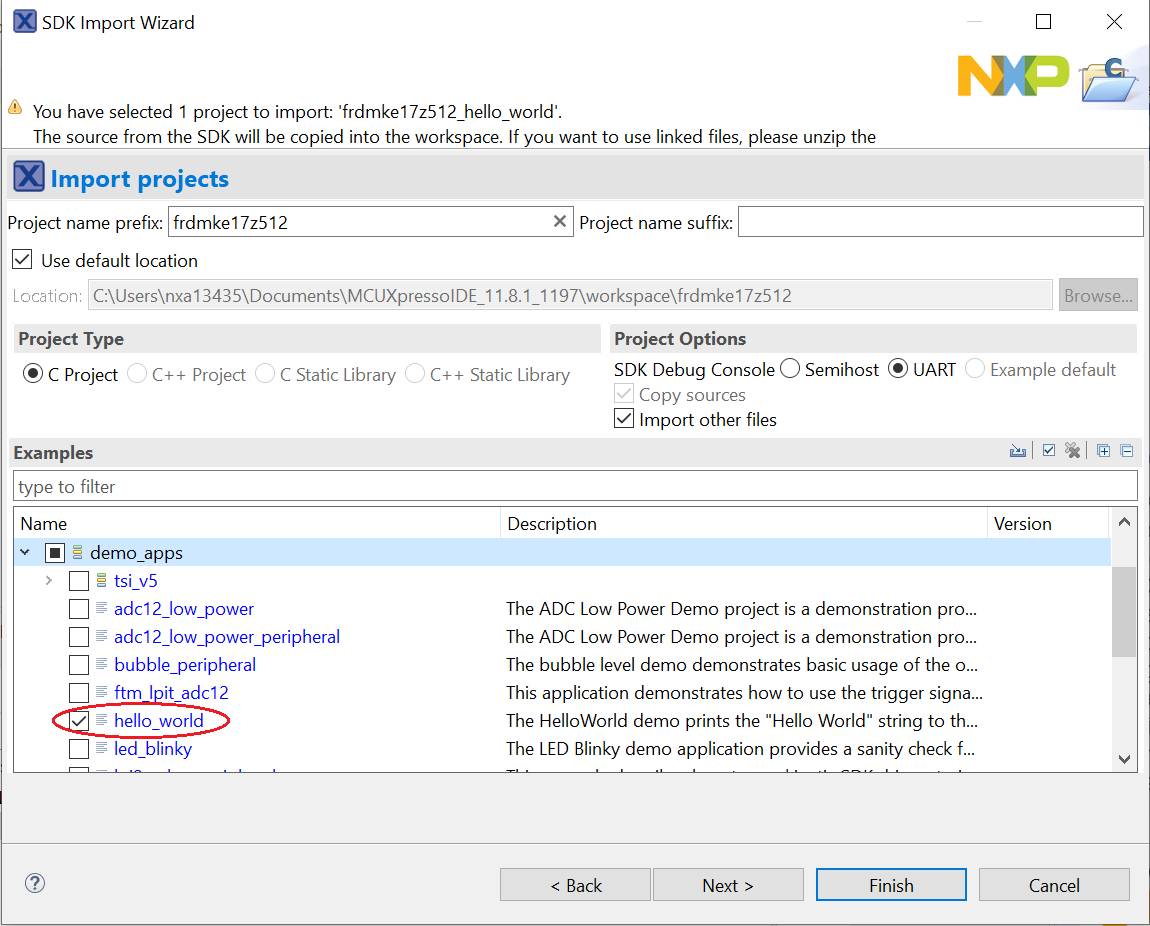 This section describes the steps required to configure MCUXpresso IDE to build, run, and debug example applications. The hello_world demo application targeted for the FRDM-KE17Z512 hardware platform is used as an example, though these steps can be applied to any example application in the MCUXpresso SDK.