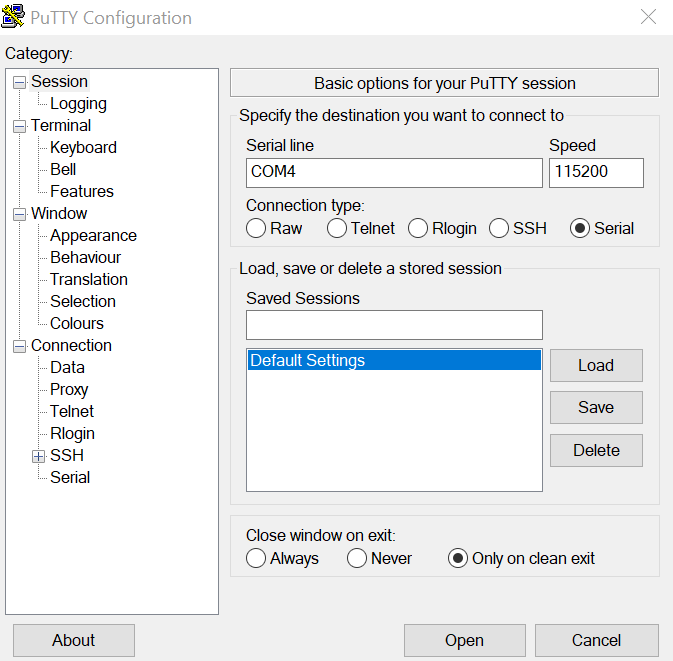 Open the terminal application on the PC, such as PuTTY or TeraTerm, and connect to the debug serial port number (to determine the COM port number, see How to determine COM port). Configure the terminal with these settings: