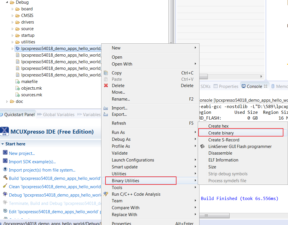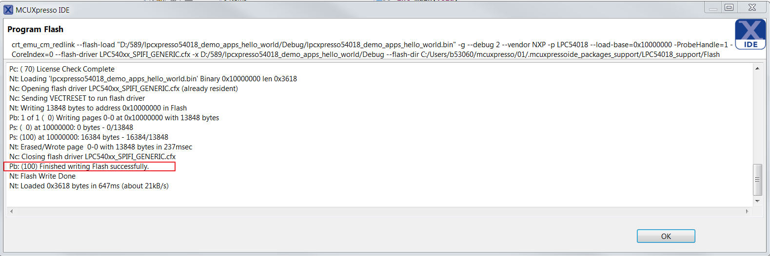 This section describes the steps required to configure MCUXpresso IDE to build, run, and debug example applications. The hello_world demo application targeted for the LPCXpresso54018 hardware platform is used as an example, though these steps can be applied to any example application in the MCUXpresso SDK.