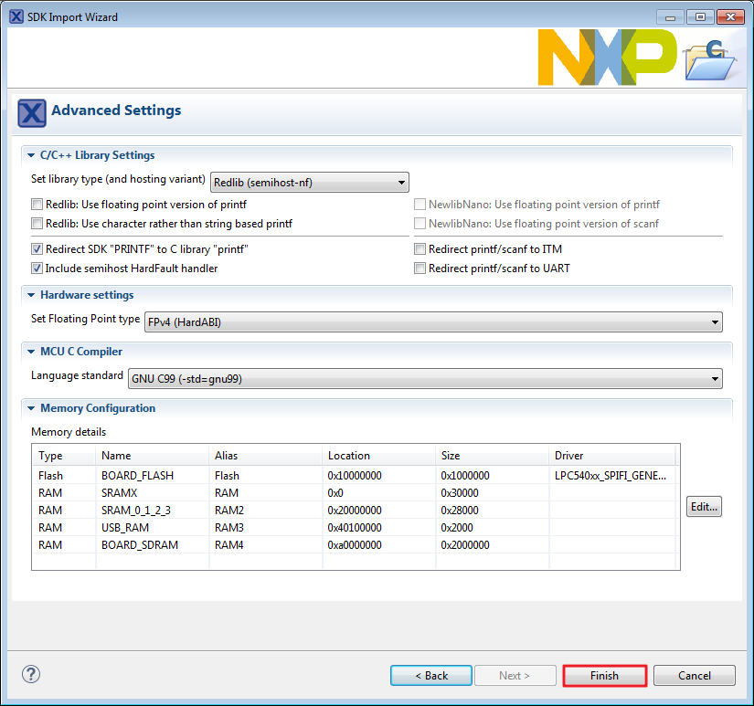Ensure the option “Redlib: Use floating point version of printf” is selected if the cases print floating point numbers on the terminal (for demo applications such as adc_basic, adc_burst, adc_dma, and adc_interrupt). Otherwise, there is no need to select it. Click the “Finish” button.