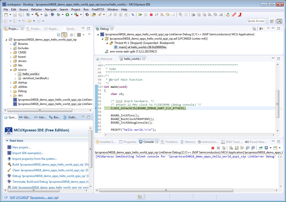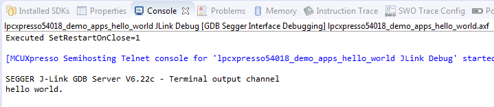 On the Quickstart Panel, click on “Debug ‘lpcxpresso54018_demo_apps_hello_world’ [Debug]”.