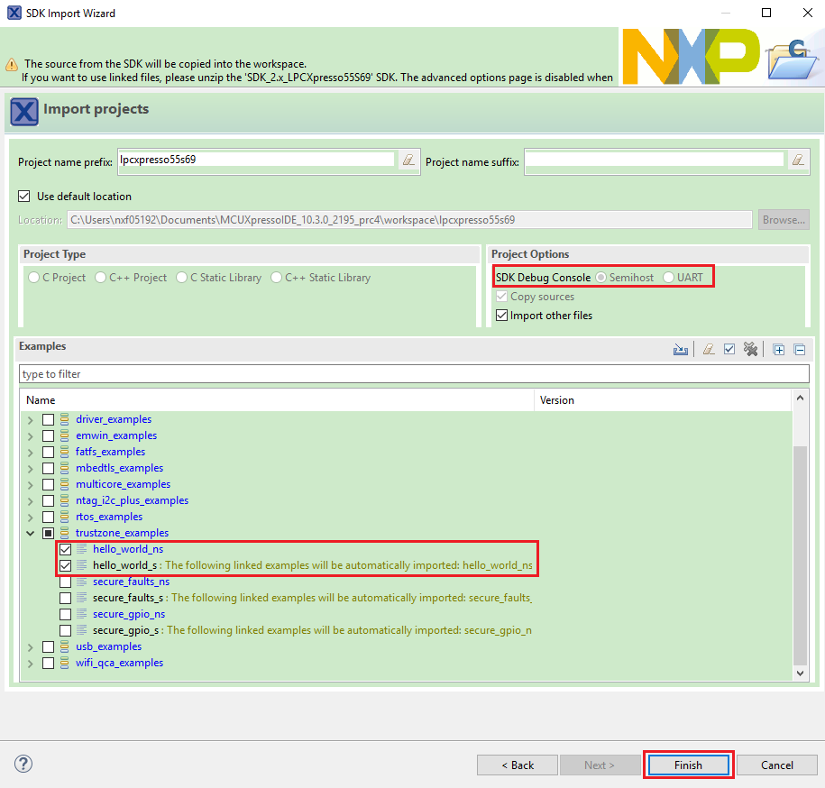 trustzone_examples/folder and selecthello_world_s. Because TrustZone examples are linked together, the non-secure project is automatically imported with the secure project, and there is no need to select it explicitly. Then select UART as SDK Debug Console. Then, click Finish.|